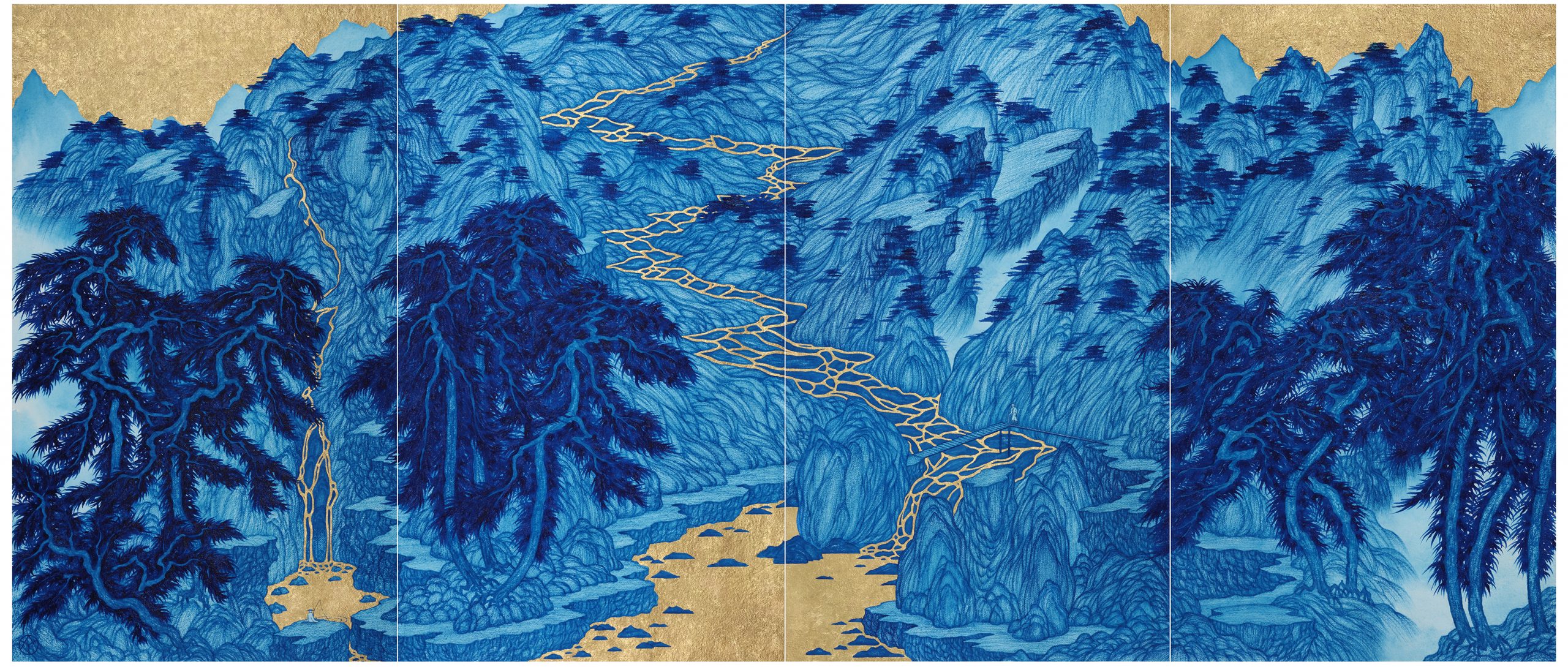 Yao is an art historian, curator and teacher whose work is visual and intellectual with a strong foundation in Chinese classical painting but using Western materials like the technical pen. This work is an iconic example of this marriage of cultures in the “blue and gold” scenery Yao is famous for.